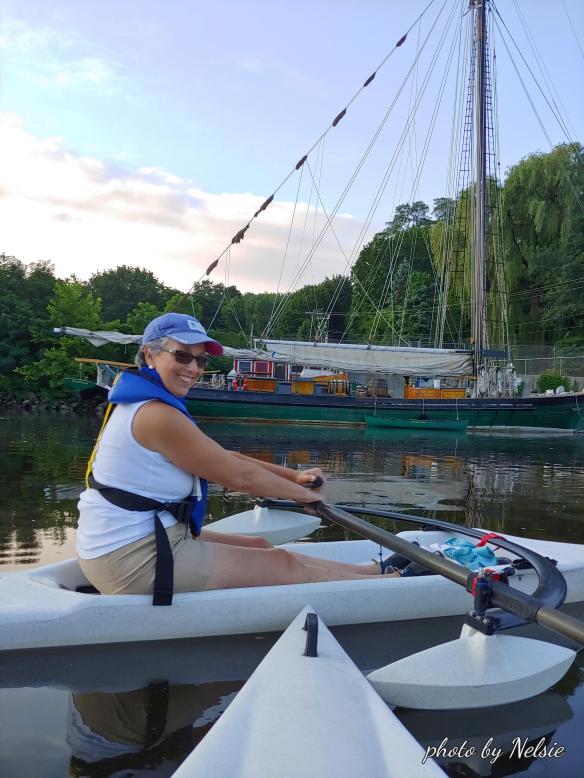 I have been fortunate to have my friend Jody Sterling to row with me today. In the past she has taken me out in her sailboat the Taffey Girl as well as a small sailboat, the Tidbit. Glad she enjoyed her first strokes. It’s hard though when you are a perfectionist. But in the end success is guaranteed. Thank you, Jody.
