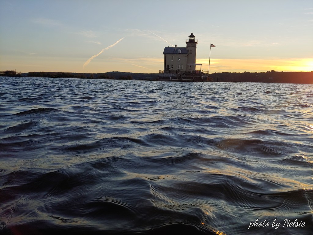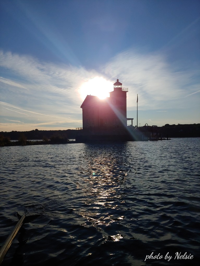 Then at the lighthouse all hell breaks loose. The wind creating quite a chop. I think I can still make it to Kingston Point Beach and give it a try but meet up with more wind and a flood current that is pushing north. But it is a tug of war with the wind blowing south and the current pushing north. I try to video tape around the Kingston Tanks but I can either hold the camera or the oars and not both. I give up and row back to the lighthouse before I surf to the lighthouse (boat is not really meant for surfing).