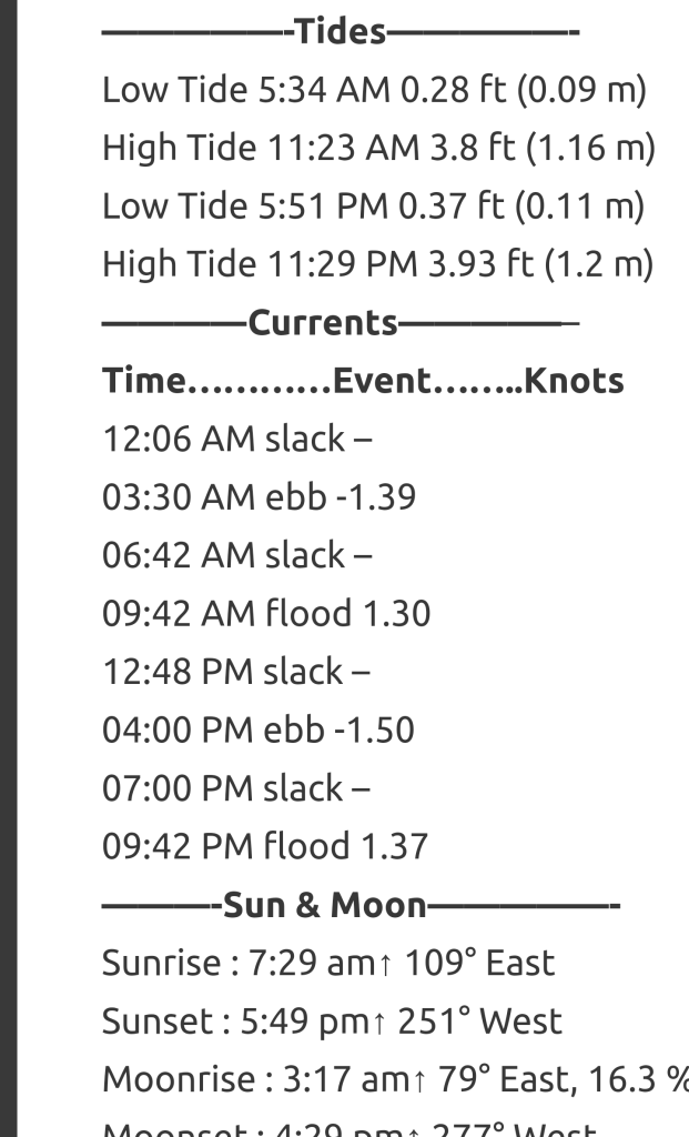 Today at 7:18am, moments before sunrise. Here is the tide setting. Low tide was at 5:34am and slack began at 6:42am. So the water should have been still. But….