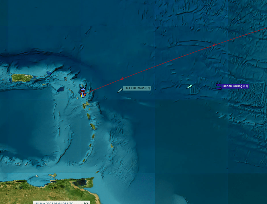 Closest is THIS GIRL ROWS who is at distance to finish 163 nautical miles and rowed 8 nautical miles in the last 24 hours. Behind her is City of Liverpool at 467 distance to finish and 23 last 24 hours with Ocean Calling 597 distance to finish and 24 nautical miles last 24 hours.