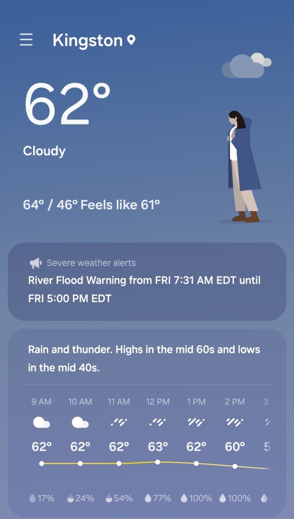 Morning weather prediction totally off Posted on April 12, 2024 by The Rondout Rower So what’s new right? Share this: Share on X (Opens in new window) X Share on Facebook (Opens in new window) Facebook Like Loading... Related