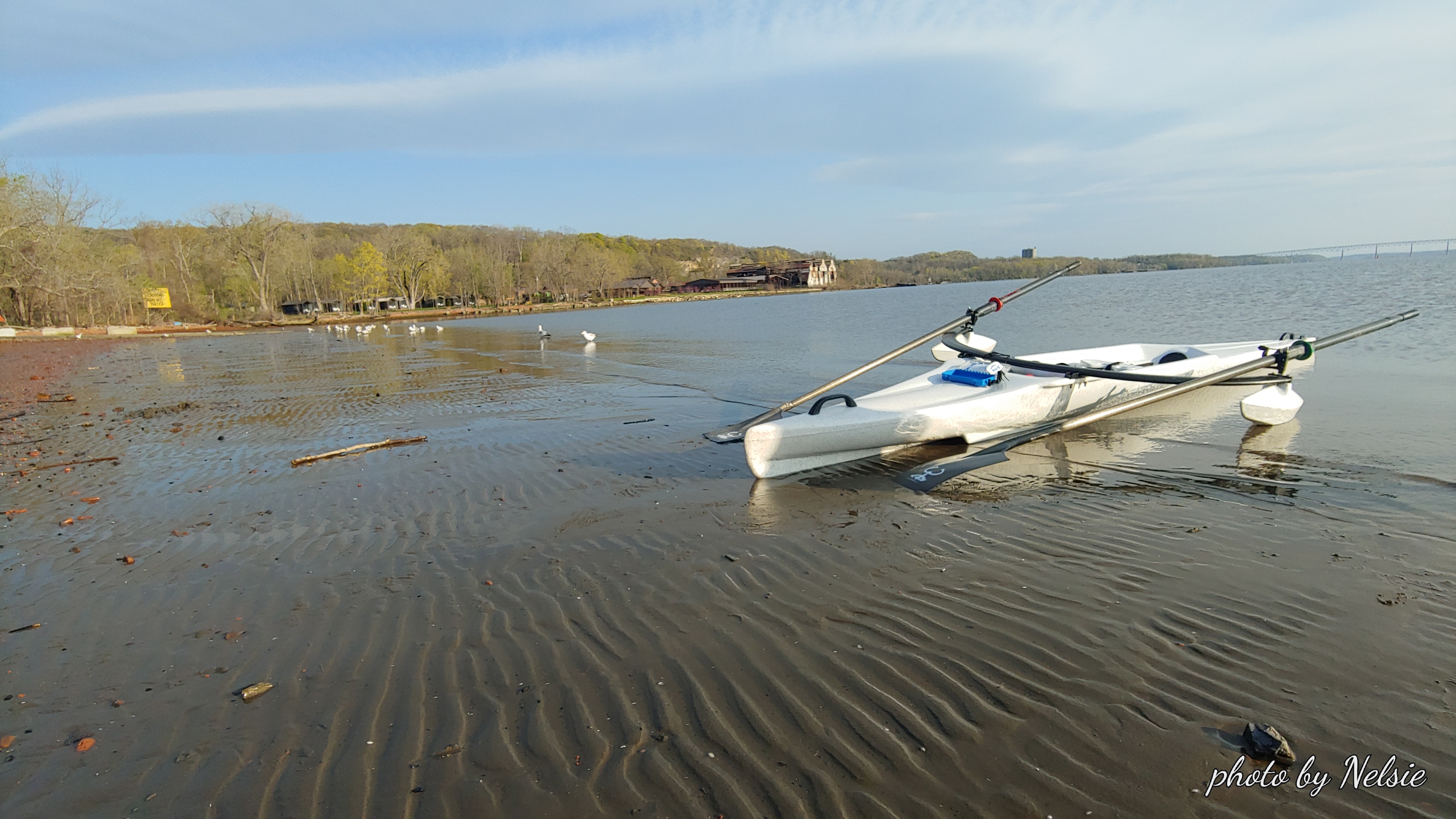 Although it looked beautiful it was quite cold. Water plus air temp was not 100 degrees but this area is very safe and shallow. The ripples in the sand in the foreground should have told me something. After we rowed a mile out the wind began to pick up. We did see an eagle on the tall trees to the left and that was a treat. A nice but short workout!